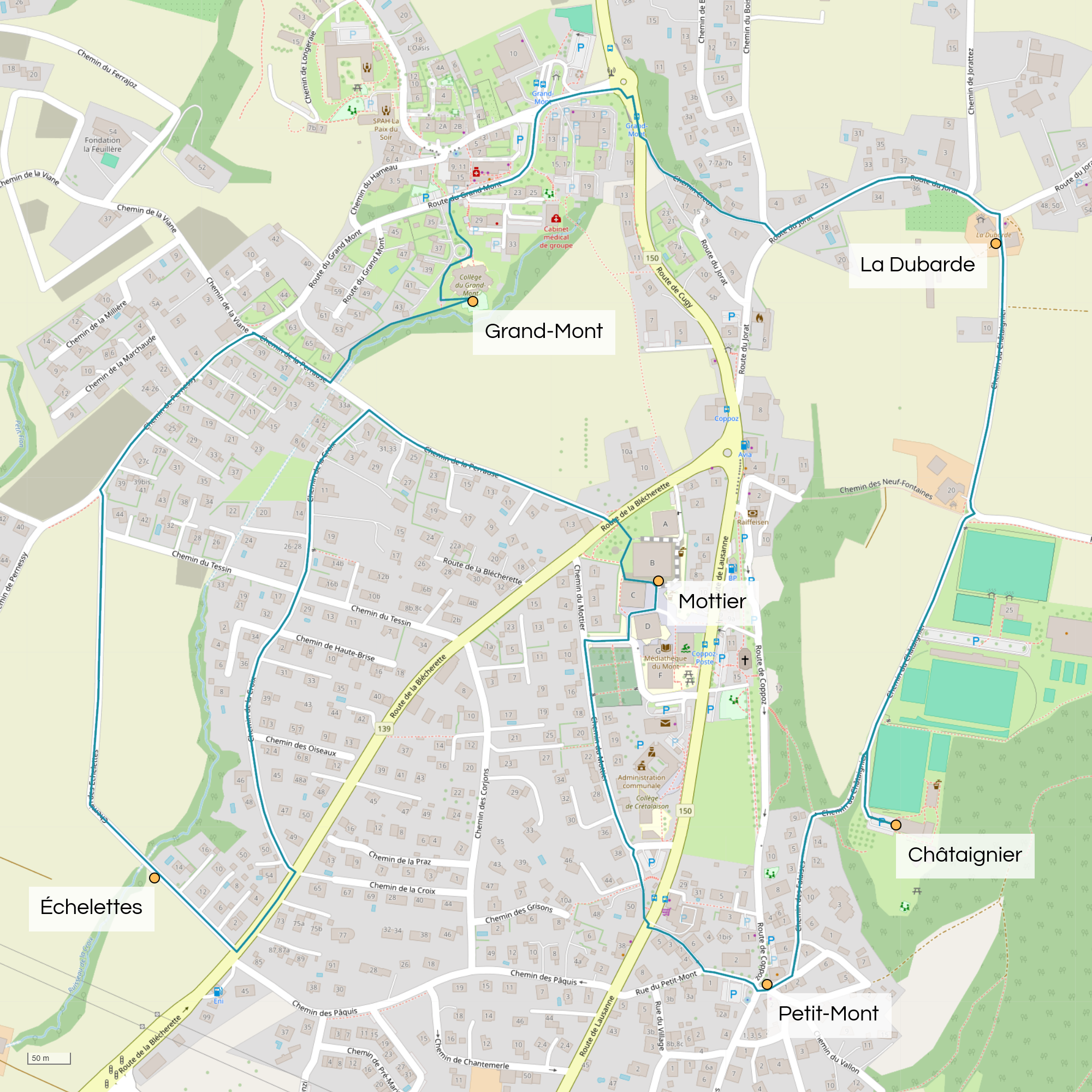 Le parcours, qui part du Châtaignier, passe par le Petit-Mont, le collège du Mottier, le chemin des Échelettes, le collège du Grand-Mont et La Dubarde. Il est accessible aux poussettes et aux personnes à mobilité réduite.